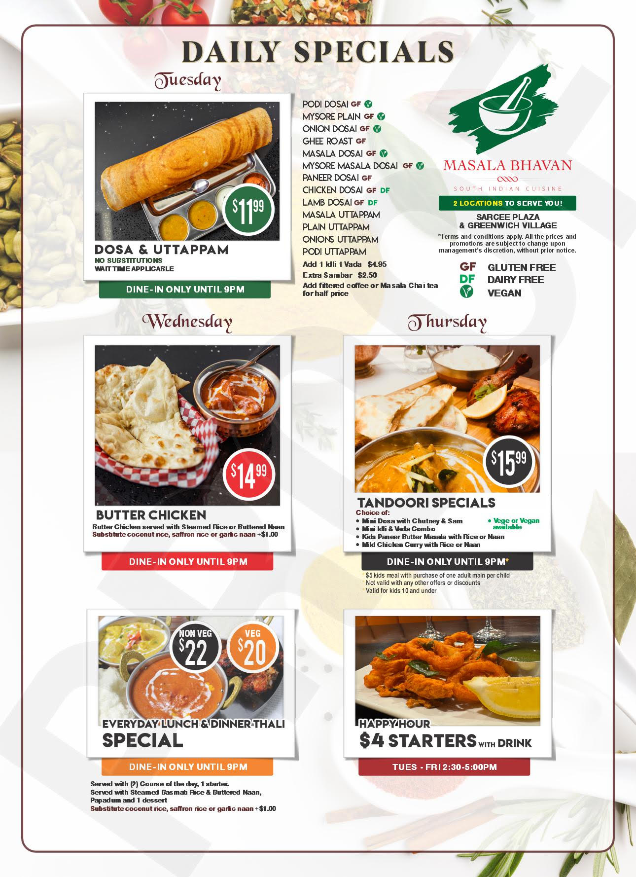 served with (2) Course of the day 1 starter, uthappam, Rice ,Butter Naan, Dessert